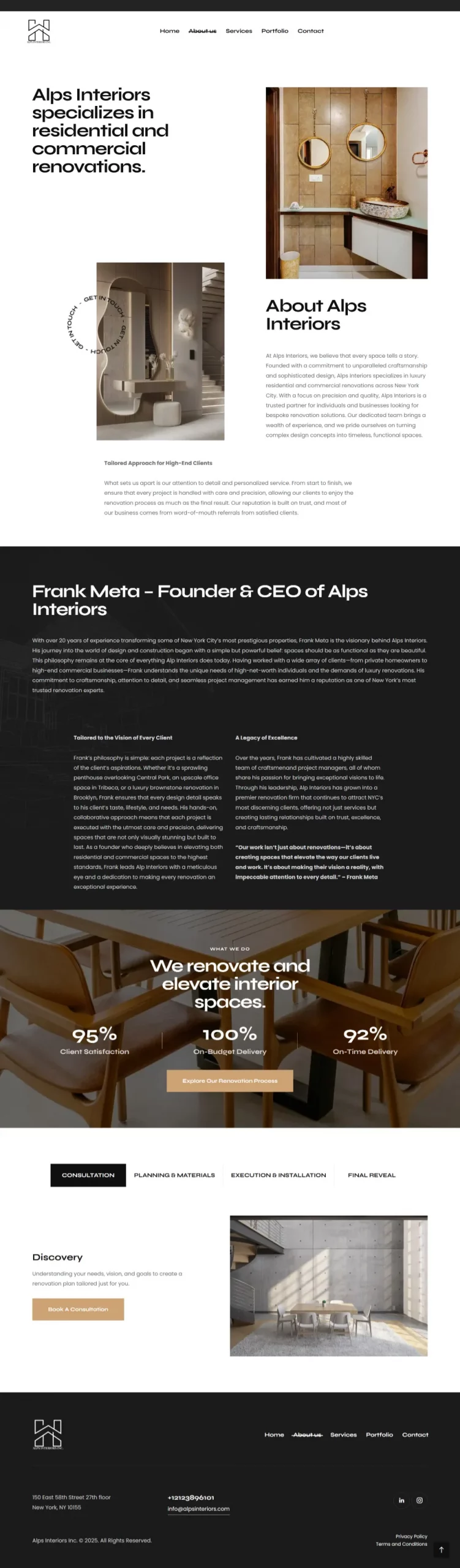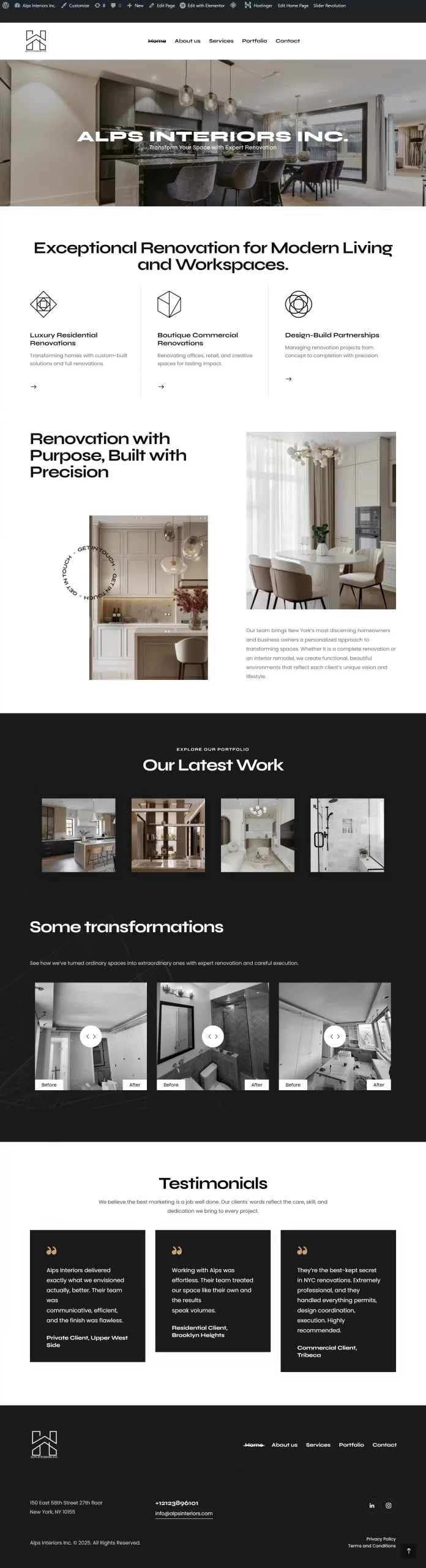 In October 2025, Cyborix developed a new online presence for Alps Interiors Inc., a New York-based luxury renovation firm specializing in high-end residential and commercial projects. The project included brand strategy, advanced Elementor implementation, site performance enhancement, and digital portfolio design. Working closely with the client, the solution balanced reliability, technical precision, and a seamless visual experience for their NYC portfolio and renovation services.